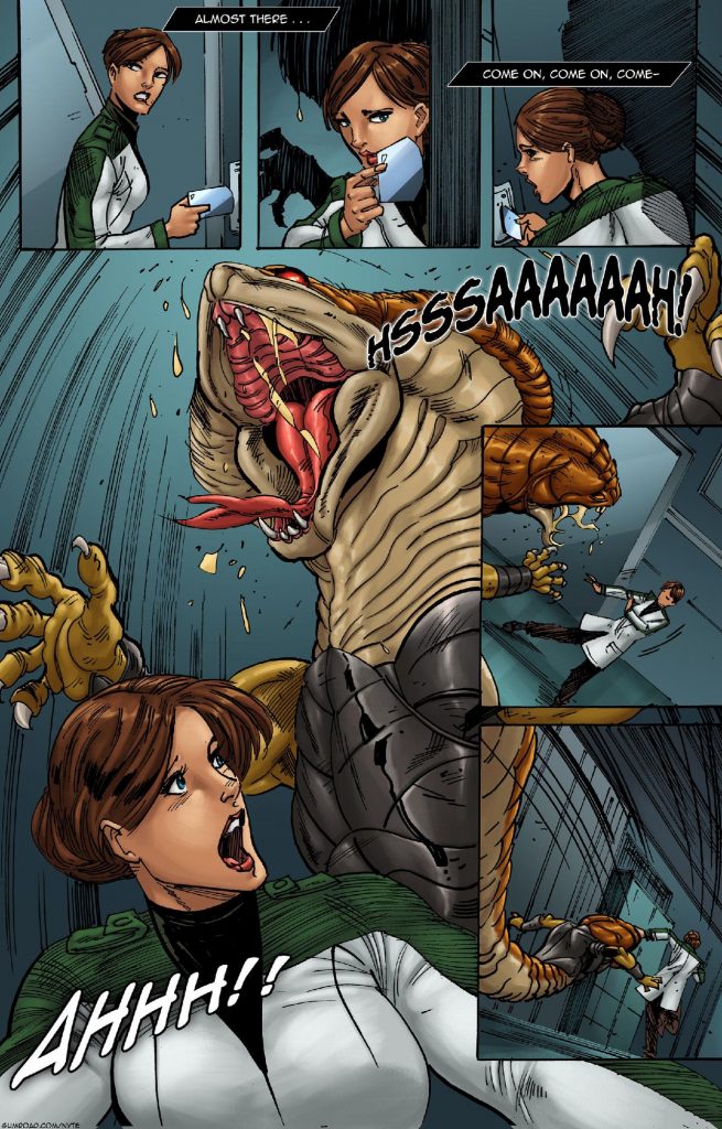 Giant and perverted snake swallowing this beautiful hot girl, who was lost in her laboratory without knowing where to go.